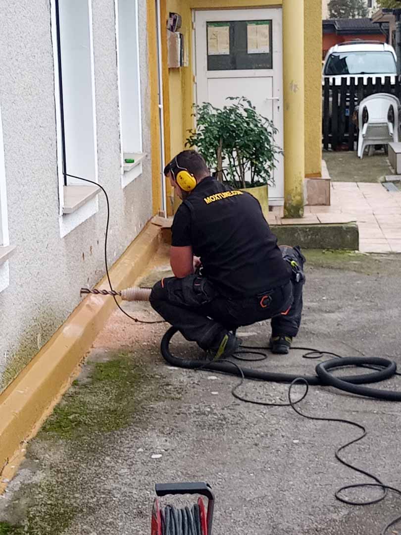 Vlažne stene saniramo s prebijanjem lukenj pod kotom in vstavljanjem posebnih plastičnih naprav v notranjost. Te naprave pomagajo posušiti vlago in zagotavljajo odvajanje dodatne vode iz sten.